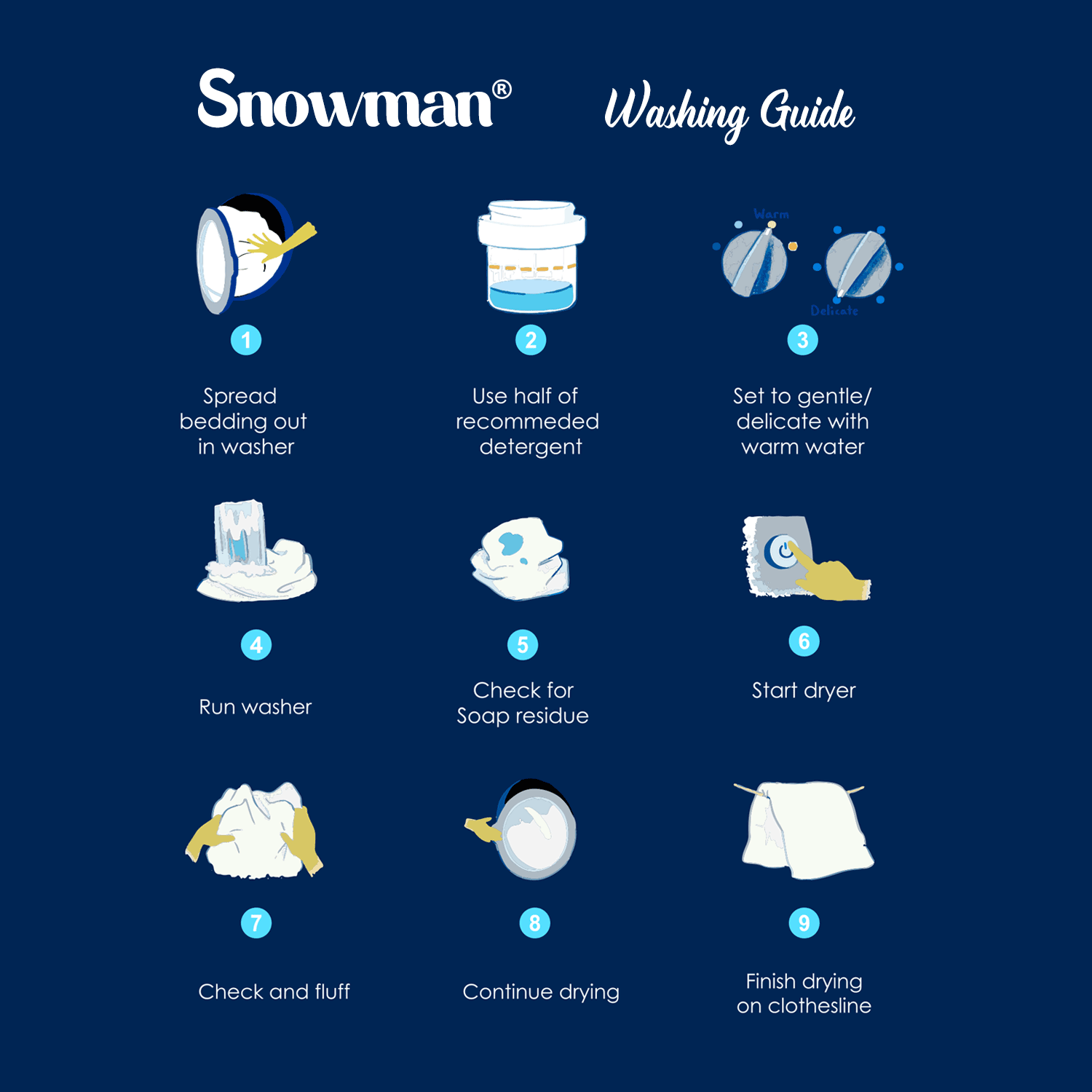 The washing process for SNOWMAN® down comforter is straightforward at home; simply follow the steps depicted in the diagram. If you keep the duvet inside a duvet cover, it will stay clean & fresh for months,you'll rarely need to clean the duvet itself.