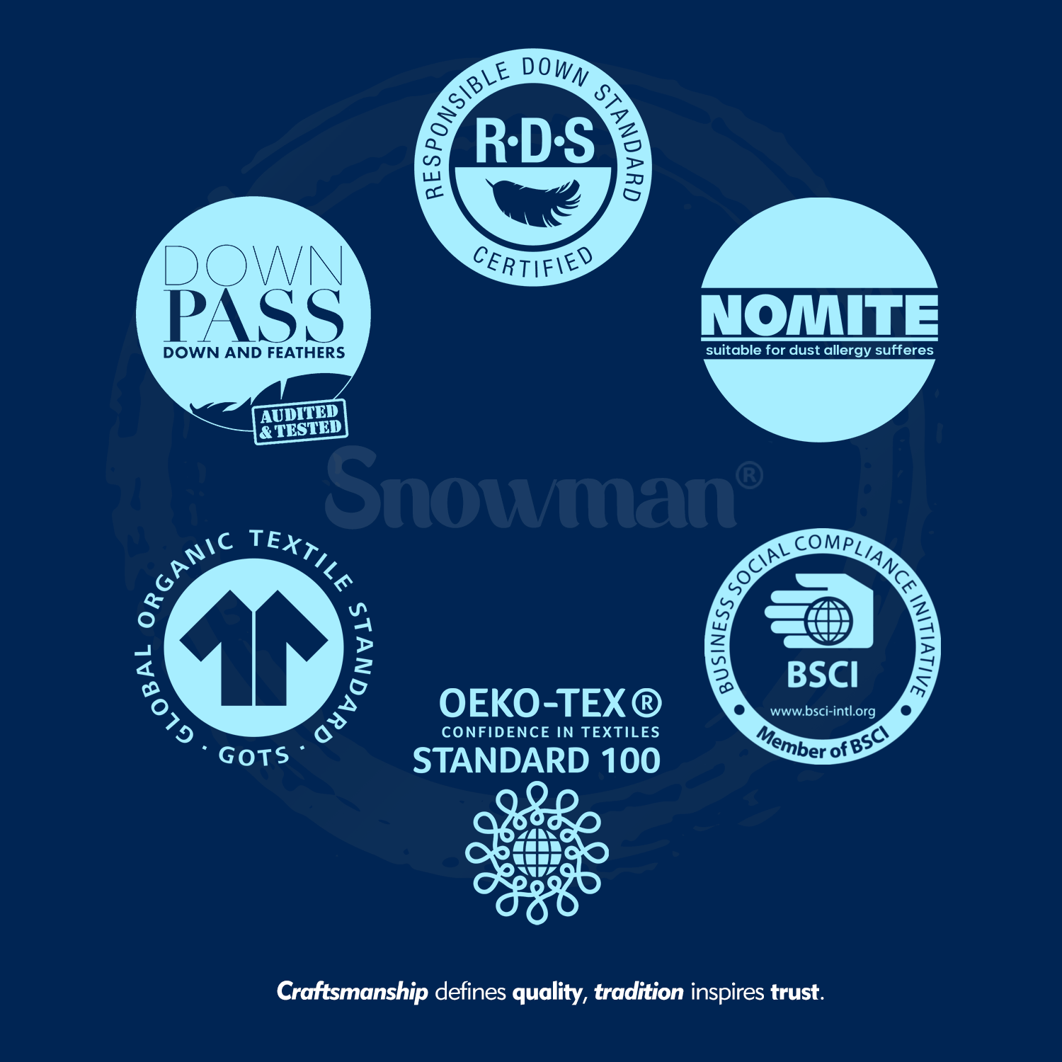 We firmly believe that human restful sleep should not come at the expense of animal welfare. SNOWMAN® has a clear stance on – and Zero Tolerance towards – animal cruelty. All down and feathers are a by-product of the meat industry which is processed into duvets and pillows. It also means that our down and feathers do not come from live animals.